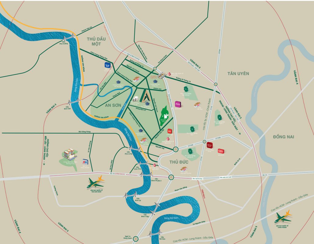 Tọa lạc ngay mặt tiền đường Nguyễn Chí Thanh, P Thuận An, TP.HCM. Vị trí này giúp cư dân dễ dàng tiếp cận BV quốc tế Colombia, BV Quốc tế Hạnh Phúc, Aeon Mall, sân golf Sông Bé, VSIP1, KCN Việt Hương và trung tâm Bình Dương cũ.